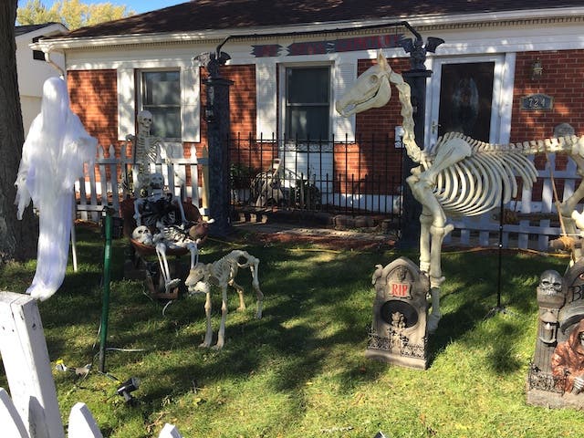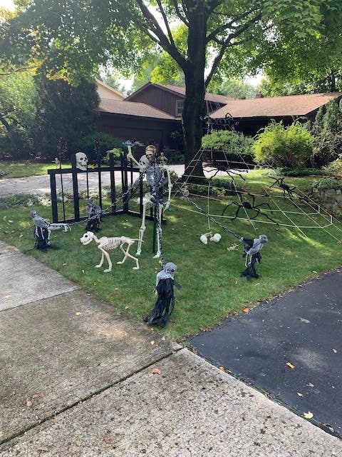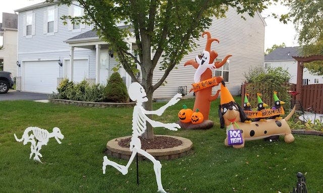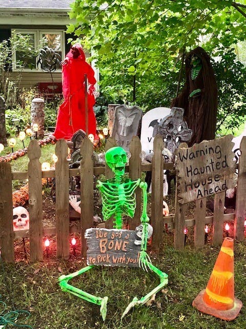 1907 CATON RIDGE DRIVE, PLAINFIELD — We love the skeleton dog chasing the skeleton in this kid-friendly display. Timmy's in the well!