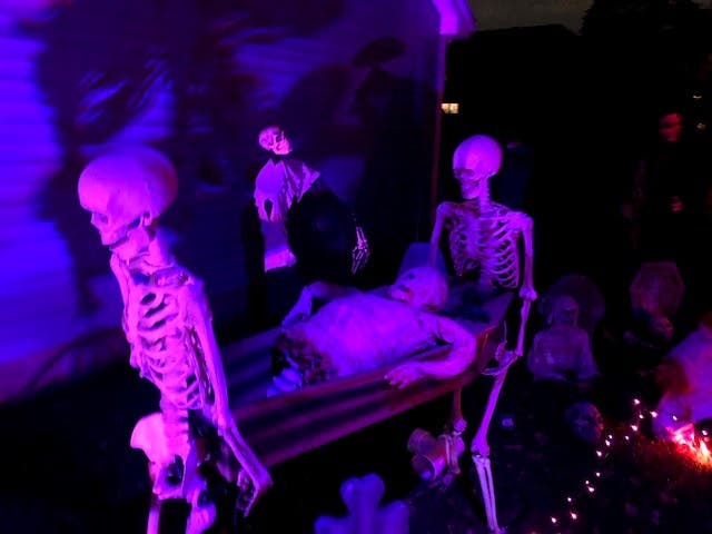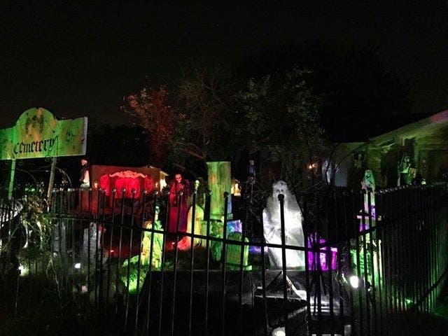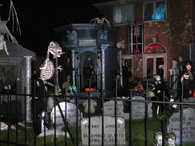 GRAVEROBBERS DEMISE, 4119 W. DEAN PARKWAY, OAK LAWN — This scary yard offers everything you need to rob a grave. An eerie cemetery scene with realistic elements, including steel fencing, hand cast cement headstones, torches, ground fog, remote-control triggered scares and a ghost projections that will scare the crap out of you. Front yard only, best viewed at night. 7 to 11 p.m. Friday, Saturday, Sunday (Oct. 25-Oct. 27) and all day on Halloween. Goodie bags for all the trick-or-treaters.