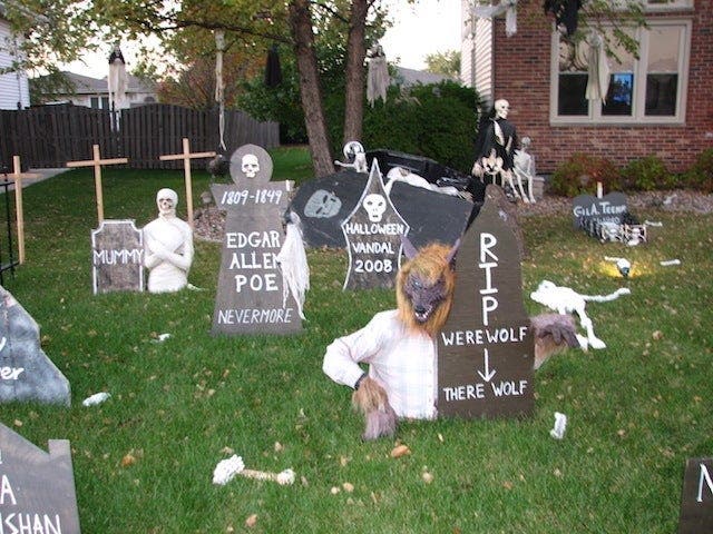 119 FORESTWAY DRIVE, DEERFIELD — Kim Rohn admits that her hubby, Dick, is a bit of a nut about decorations. Dick transforms their front lawn into an amazing graveyard. Headstones include famous scary folks, along with the usual Frankenstein and Dracula standbys. The display is educational for the kiddies, featuring custom designs of Salem witch covens with literary quotes from Shakespeare, Edgar Allen Poe, Mary Shelley, Stephen King and more.