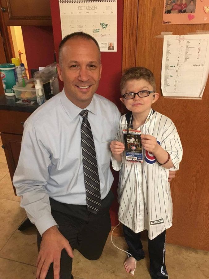 The Steinhauser family can't often catch a break from Dominic's condition, which requires extensive care and can lead to frequent hospital stays—15 visits in the last 15 months. Their lives "revolve around his treatments, what we can do to keep up." But the little boy who faces big obstacles got quite the surprise Thursday when a very kind stranger stopped by to hand over tickets to a dream come true: seats to watch the Cubs play in the World Series at Wrigley Field.