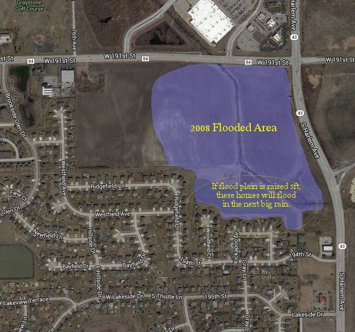 Tinley Park Deputy Planning Director Paula Wallrich said the land would have be raised at least five feet to street level—a concept that troubles residents of neighboring Brookside Glen subdivision. Developers would transfer dirt from a nearby sod farm, which could cause residents’ yards and homes to flood.