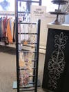 A bed in the middle of the store? Why not? You think end tables belong on the floor? Don’t be silly. At , Norkaitis hung them on the wall to display handbags on the lower shelf and hang tops and jackets from industrial pipes mounted underneath. At , a tall, laddered CD rack became an elegant display for necklaces and bracelets.