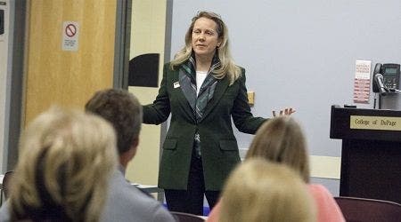 College of DuPage Board Chairman Deanne Mazzochi (above) speaks with members of the Carol Stream community at the first of five Town Hall meetings hosted with President Dr. Ann Rondeau. Click here for more photos from the event.