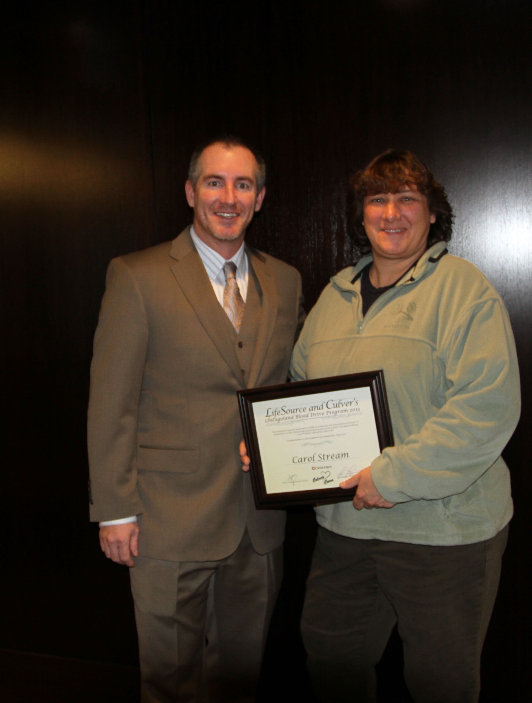 Amy Adams, owner of Culver's of Carol Stream, is presented with a certificate of recognition from LifeSource's Executive Director of Blood Services, Chad Douglas. Chicagoland Culver's restaurants hosted partnered "Give a Pint, Get a Pint" blood drives over the summer and received more than 1,000 donations for LifeSource.