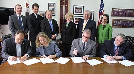 Glen Ellyn Village President Alex Demos, College of DuPage Board of Trustees Chairman Deanne Mazzochi, Chairman Dan Cronin and County Clerk Paul Hinds sign an intergovernmental agreement transferring authority for inspections at COD back to Glen Ellyn. Watching on are District 4 County Board member Tim Elliott, Glen Ellyn Village Manager Mark Franz, District 4 County Board member Grant Eckhoff, College of DuPage President Dr. Ann Rondeau, County Development Committee Chairman Sam Tornatore and District 4 County Board member Amy Grant.