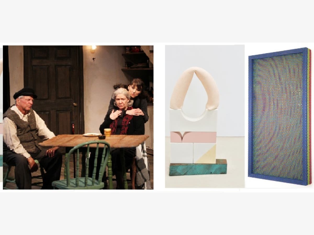 Left Photo: Norm Woodel, Millie Hurley and Kelli Walker in “Outside Mullingar; Photo by Rex Howard Photography: Right Photos: works by Mie Kongo, Gina Hunt; Photos courtesy of the Cleve Carney Art Gallery