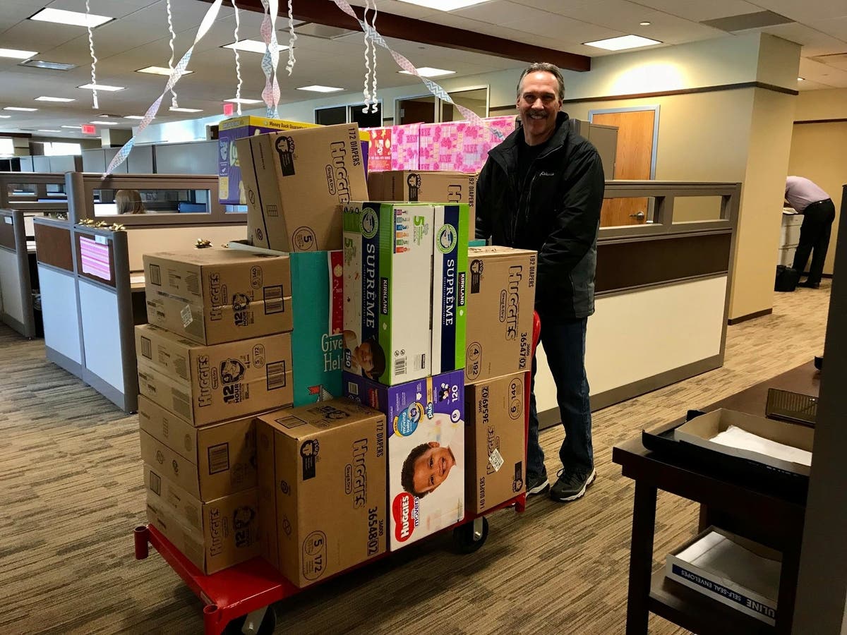 PHOTO CAPTION: Twice As Nice Mother & Child volunteer Gary Kwiecinski picks up donations at Mowery & Schoenfeld in Lincolnshire during last year's Deck the Halls with Diapers campaign. The 2018 collection is ongoing now through Dec. 31 at more than a dozen partnering business locations./PHOTO CREDIT: SUBMITTED
