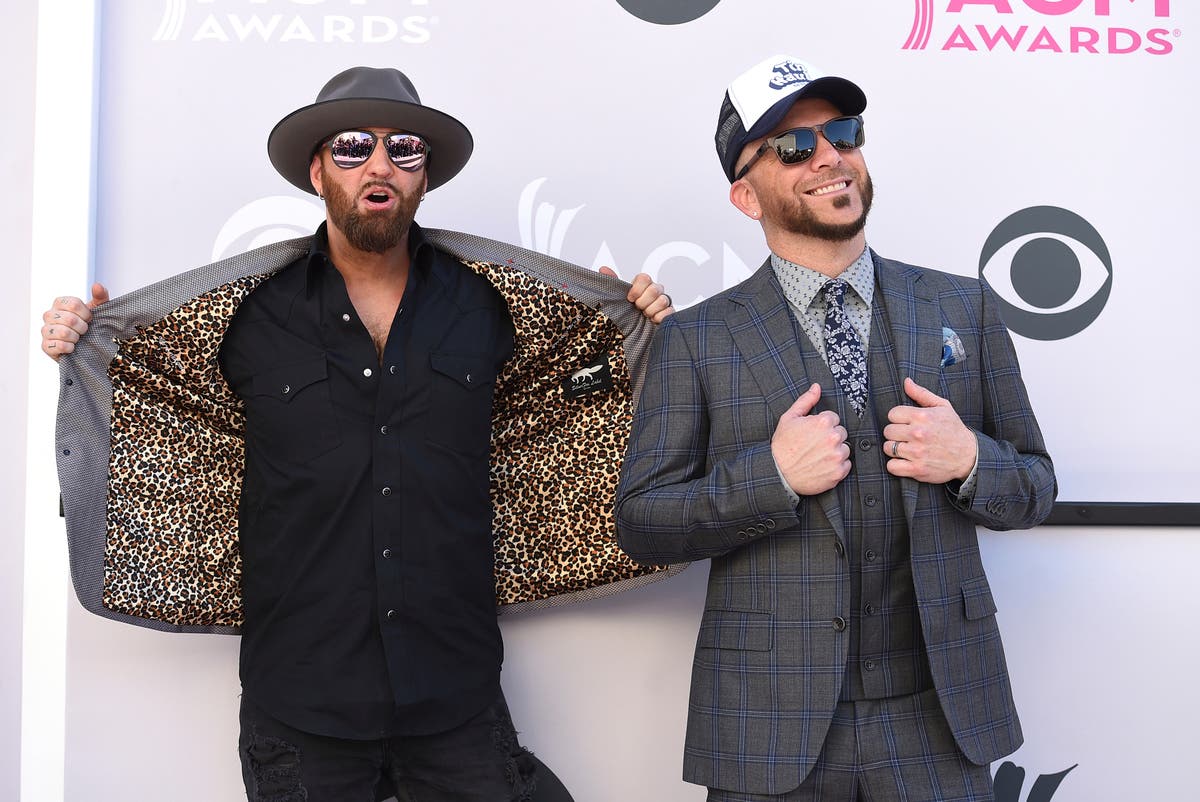 Photo caption: Preston Brust, left, and Chris Lucas, of LOCASH, arrive at the 52nd annual Academy of Country Music Awards at the T-Mobile Arena on Sunday, April 2, 2017, in Las Vegas. Photo caption: Jordan Strauss/Invision/AP