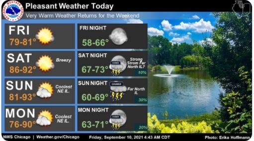 Saturday has a high of 92 degrees, and it will be breezy and sunny during the day. The weather service said strong storms are possible Saturday night, especially in far northern Illinois.