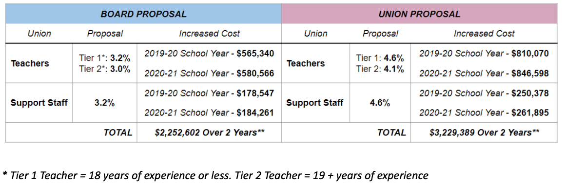 The school board's proposal would cost the school district $2.252 million over the next two years while the union proposal would cost $3.229 million.