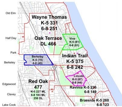 Possible optional boundary changes include giving the option to attend Wayne Thomas to students currently in a portion of the Sherwood catchment area north of Berkeley Court and to those north of Vine Street, as well as giving students living south of Lincoln Avenue West in the catchment area of Indian Trail the option of attending Ravinia or Braeside.