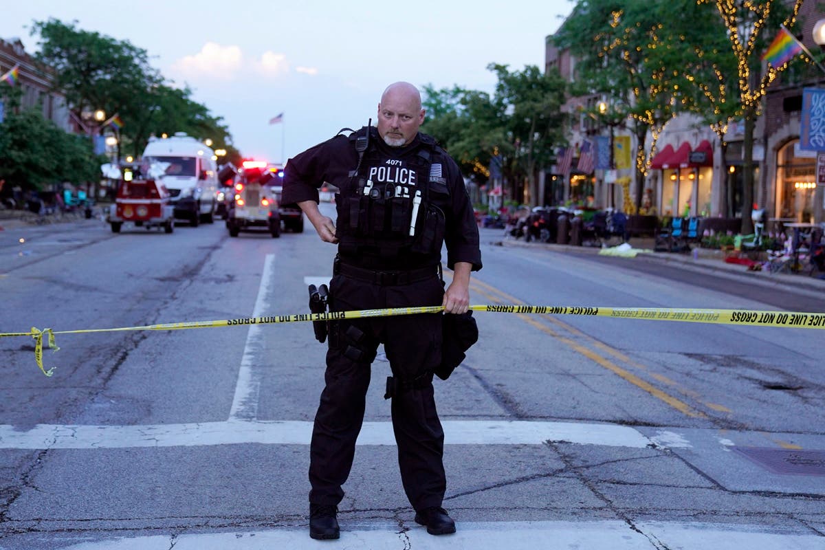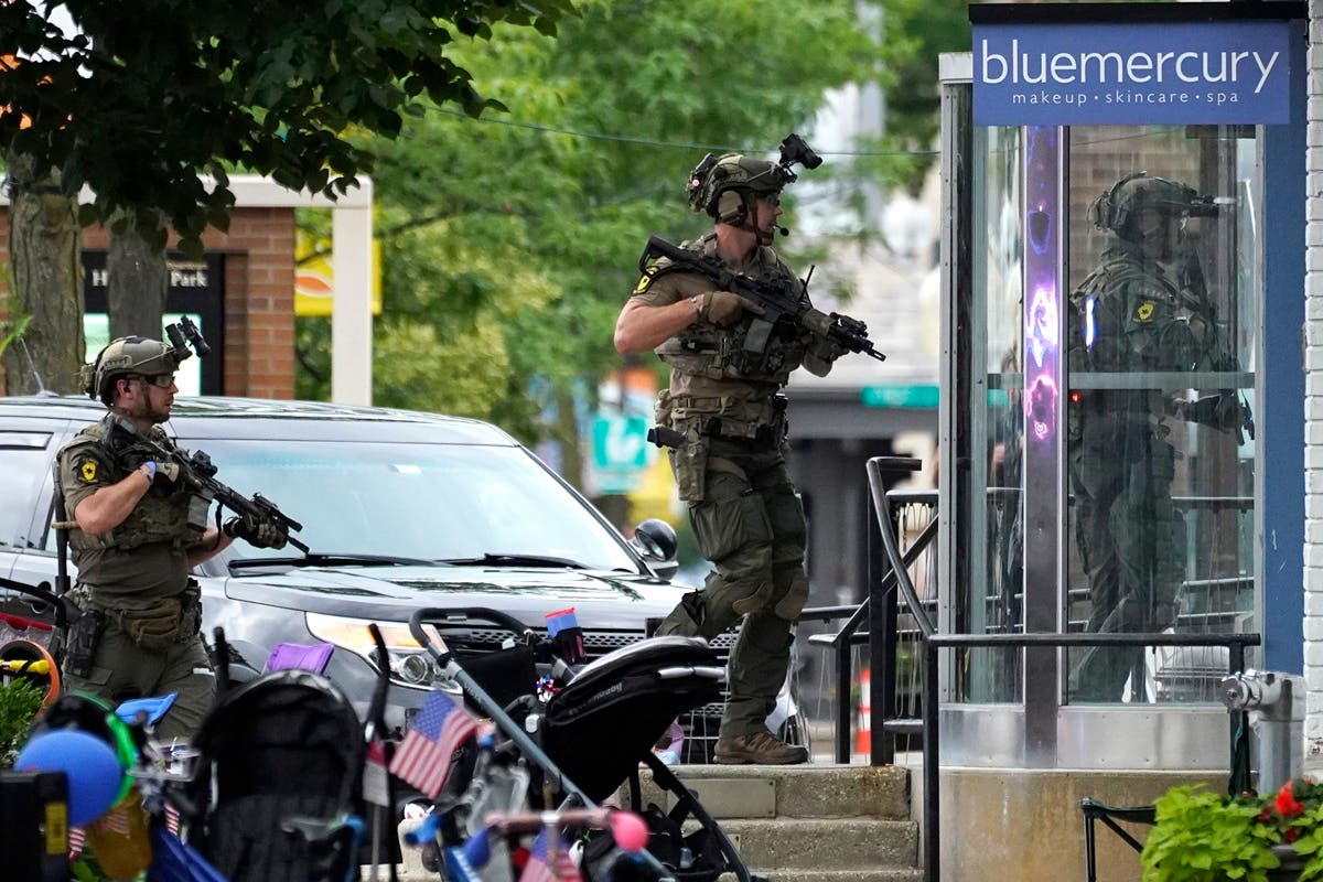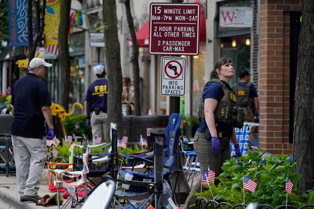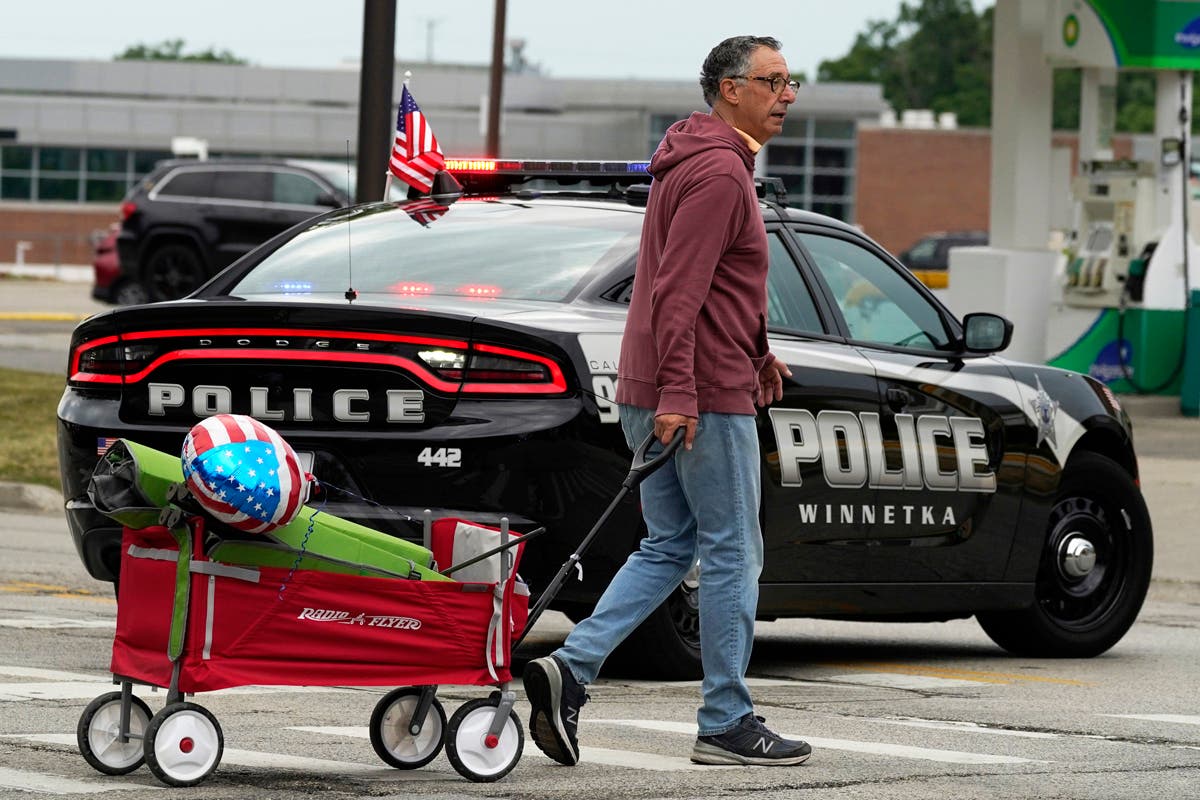 Law enforcement search in a building after a mass shooting at the Highland Park Fourth of July parade in downtown Highland Park, Ill., a Chicago suburb, on Monday, July 4, 2022. (AP Photo/Nam Y. Huh)A Lake Forest police officer walks down Central Ave in Highland Park on Monday, after a shooter opened fire on the northern suburb's Fourth of July parade. (Brian Cassella/Chicago Tribune via AP)This undated handout photo provided by the City of Highland Park Police Department shows Robert (Bobby) E. Crimo III. Highland Park Police Chief Lou Jogmen said Monday, July 4, 2022, that police identified 22-year-old Crimo as a person of interest in an Independence Day parade shooting in suburban Chicago. (City of Highland Park Police Department via AP)A woman wipes tears after a mass shooting at the Highland Park Fourth of July parade in Highland Park on Monday. (AP Photo/Nam Y. Huh)People check their belongings after the shooting. (AP Photo/Nam Y. Huh) Law enforcement search the area. (AP Photo/Nam Y. Huh)A man carries his belongings after the shooting occurred. (AP Photo/Nam Y. Huh)A woman looks outside from her home at the chaos below. (AP Photo/Nam Y. Huh)Law enforcement conduct a search. (AP Photo/Nam Y. Huh)American flags are pictured where the shooting took place. (AP Photo/Nam Y. Huh)Officers from the Illinois State Police confer near the scene of the hooting involving multiple victims. (Joe Lewnard/Daily Herald via AP)People take photos of the area where the shooting occurred. (AP Photo/Nam Y. Huh)Law enforcement conduct a search of the grounds. (AP Photo/Nam Y. Huh)People are escorted away from the scene. (John Starks/Daily Herald via AP)A stretcher is seen after behind the taped-off area. (AP Photo/Nam Y. Huh)Law enforcement search after near the shooting. (AP Photo/Nam Y. Huh)Sen. Tammy Duckworth, right, D-Ill., speaks as Illinois Gov. J.B. Pritzker listens at a news conference at Highland Park Fire Department Station 33, after the mass shooting. (AP Photo/Nam Y. Huh)A police officer holds up police tape at the scene. (AP Photo/Nam Y. Huh)People outside the Highland Park police department after Robert E. Crime III was taken into custody on Monday. (AP Photo/Nam Y. Huh)Two police officers stand their post, the day after a deadly mass shooting on the west side of Highland Park on Tuesday, as the American flag flies at half-staff on the east side. (AP Photo/Charles Rex Arbogast)Elliot Lieberman gathers his folding chairs on Tuesday, one day after a mass shooting. (AP Photo/Charles Rex Arbogast)A Metra commuter train passes through the Highland Park, Ill. train station, without making a stop, one day after a mass shooting in the suburban Chicago town Tuesday. (AP Photo/Charles Rex Arbogast)The Associated Press contributed to this post.