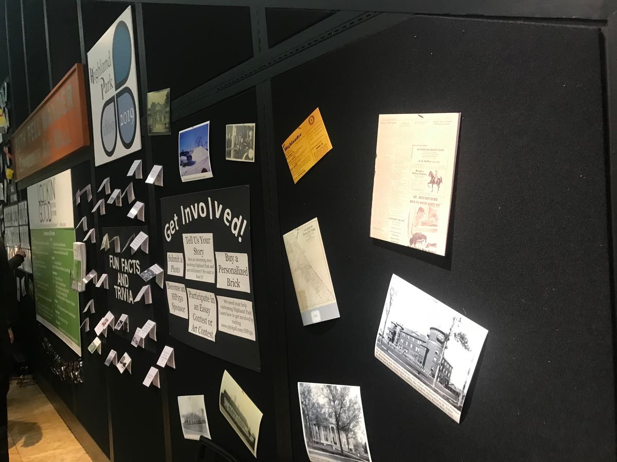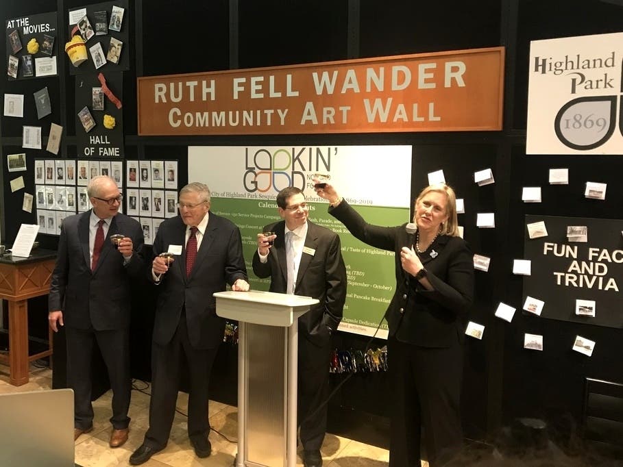 The event marked the unveiling of a city-sponsored exhibit highlighting a year of events in honor of Highland Park's 150th birthday. Installed on a downtown bank's community art wall, it features historical photographs, facts and trivia and a hall of fame of notable locals.
