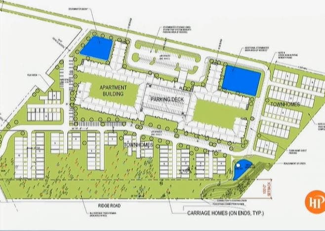 The proposal includes 131 townhouses and a four-story "wrap style" apartment building with 400 rental units. It would include an interior parking garage with with one floor serving each floor of apartments. An earlier version of the plan also included 12 carriage homes.