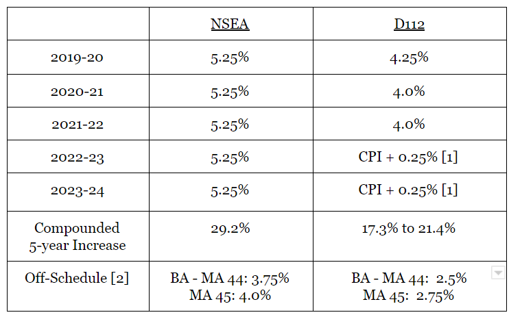 According to Article 17 of the agreement, "off-schedule" teachers received salary increases of 2 percent, while those "on-schedule" got increases of 4 percent, 4.37 percent and 4.56 percent in the first three years of the five-year deal. Educators are subject to smaller "off-schedule" salary increases once they reach a maximum number of years of experience for their level of education.