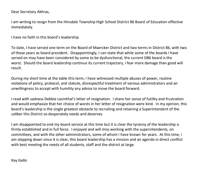 HINSDALE, IL – Kay Gallo, a member of the Hinsdale High School District 86 board, resigned effective immediately at Thursday's board meeting.