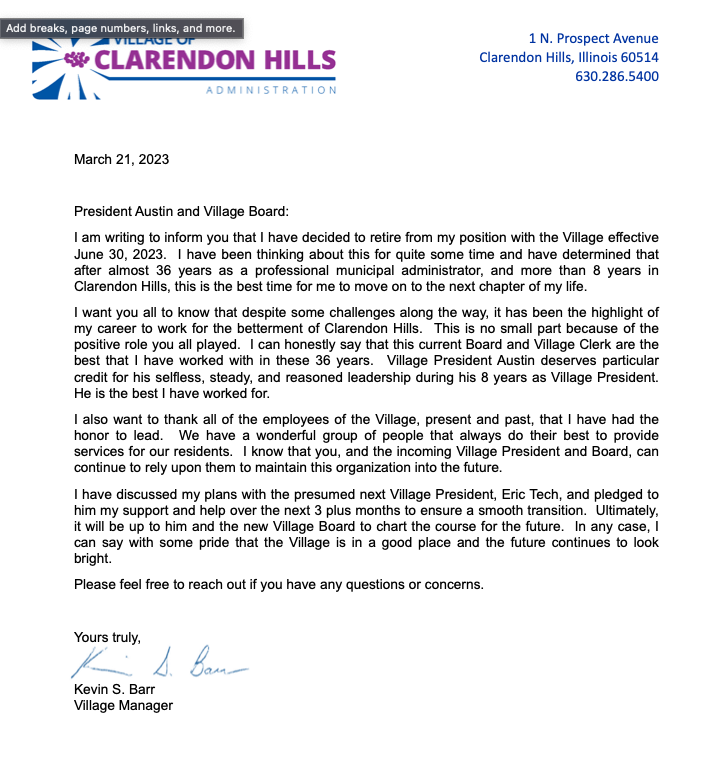 CLARENDON HILLS, IL – Kevin Barr, Clarendon Hills' village manager for the last eight years, is retiring.