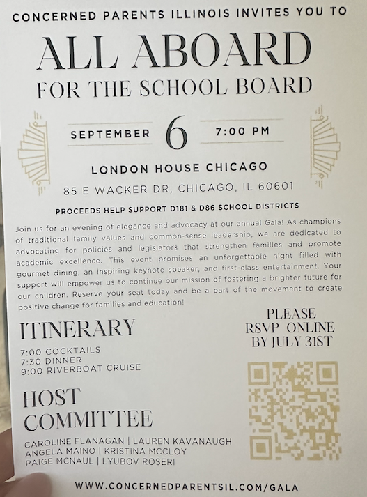 A flyer for the "All Aboard for the School Board" gala says the proceeds will support Hinsdale High School District 86 and Hinsdale School District 181. Tickets are $495 each.