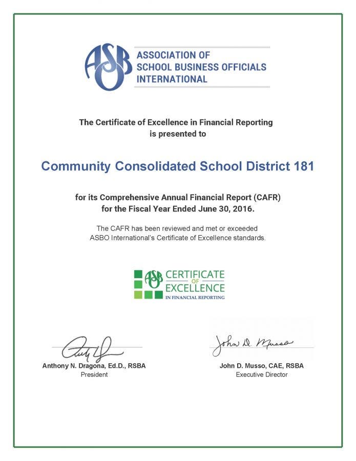 Community Consolidated School District 181 has received the Association of School Business Officials International's (ASBO) Certificate of Excellence in Financial Reporting award for having met or exceeded the program's high standards for financial reporting and accountability. The District was recognized for its Comprehensive Annual Financial Report (CAFR) for the fiscal year ending 2016, the 13th such recognition the District has received. The Certificate of Excellence (COE) award confirms the District's commitment to financial accountability and transparency.