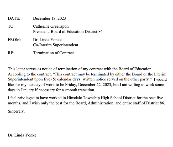 "I feel privileged to have worked in Hinsdale Township High School District for the past five months, and I wish only the best for the Board, Administration, and entire staff of District 86," Yonke said.