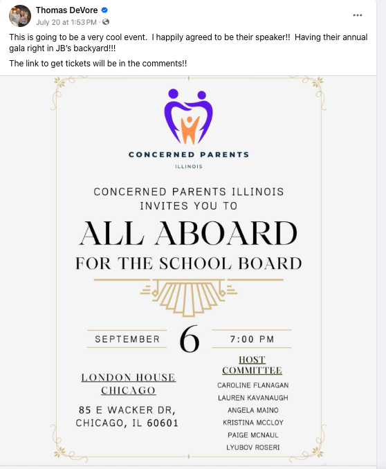 On social media, Thomas DeVore, a former Republican attorney general candidate, announced he was named the speaker for the "All Aboard for the School Board" gala.