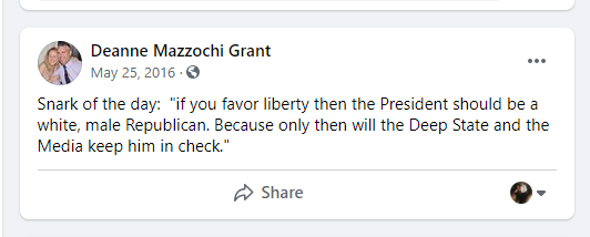 "If you favor liberty then the President should be a white, male Republican. Because only then will the Deep State and the Media keep him in check," she wrote.