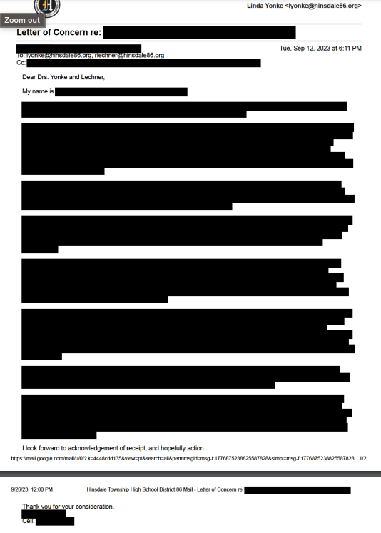 HINSDALE, IL – Hinsdale High School District 86 on Wednesday blacked out an email from a parent that prompted the district to hire a lawyer to investigate.
