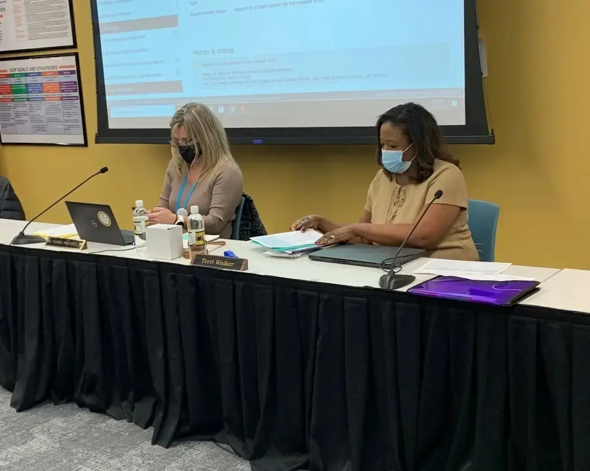 Tammy Prentiss (left), superintendent of Hinsdale High School District 86, and then-board President Terri Walker attend a board meeting in early 2022. This was when the mask mandate was still in effect. (David Giuliani/Patch)
