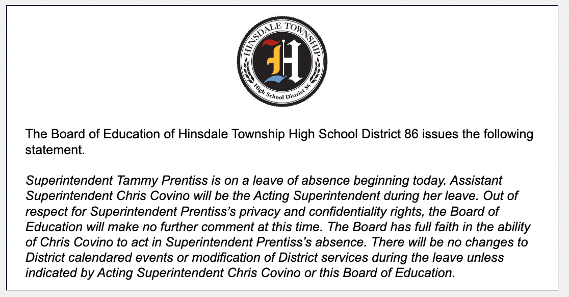 HINSDALE, IL – Tammy Prentiss, superintendent of Hinsdale High School District 86, is on a "leave of absence" beginning Tuesday, the school board announced.