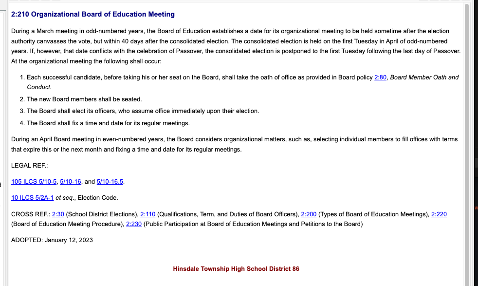 HINSDALE, IL – The Hinsdale High School District 86 board's policies call for it to choose officers for the next year by the end of April.