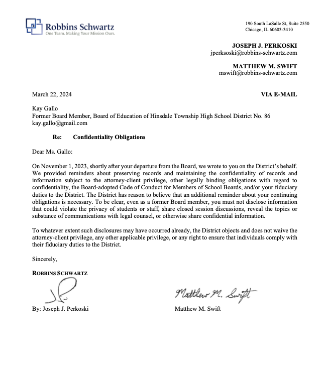 HINSDALE, IL – For the second time since her resignation, Hinsdale High School District 86's law firm warned former board member Kay Gallo not to release information that the district considers confidential.