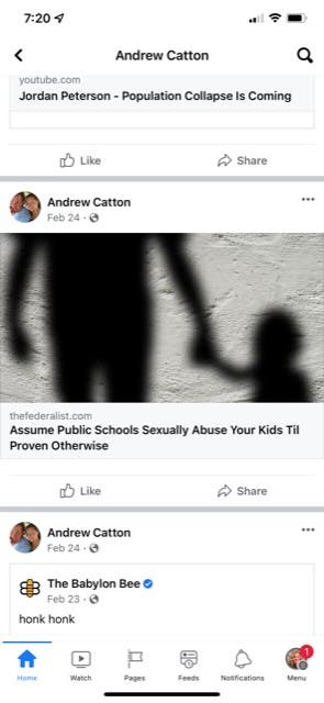 In February, Catton's shared a post from The Federalist, a conservative website, about assuming sexual abuse takes place in schools, unless proven otherwise.