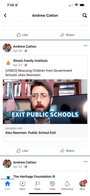The candidate, Andrew Catton of Hinsdale, also posted a story titled, "Assume Public Schools Sexually Abuse Your Kids Til Proven Otherwise."