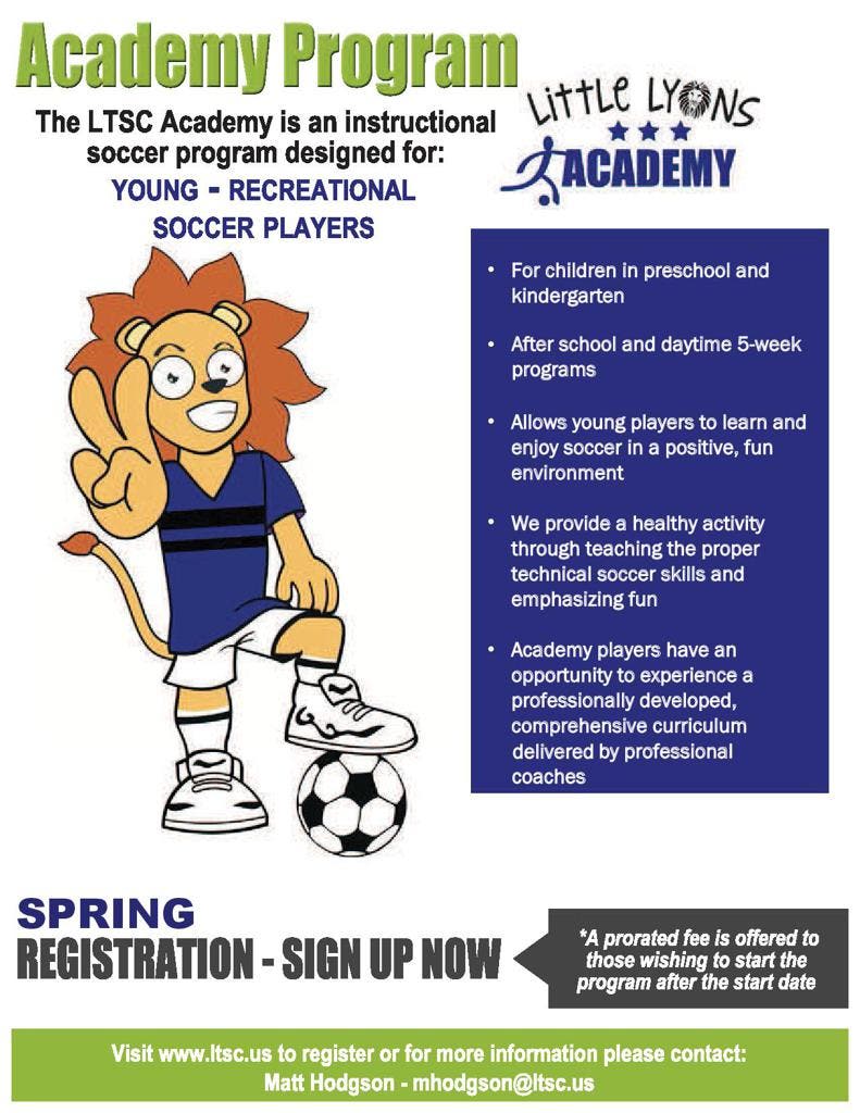 Keep Soccer fun for your Pre K and K player during the day time. Contact Mhodgson@ltsc.us for more information. Sessions start on April 19th