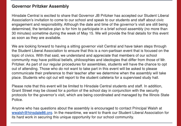 In its weekly newsletter, Hinsdale Central led with the announcement of Pritzker's visit. It referred any questions to the principal's email address.