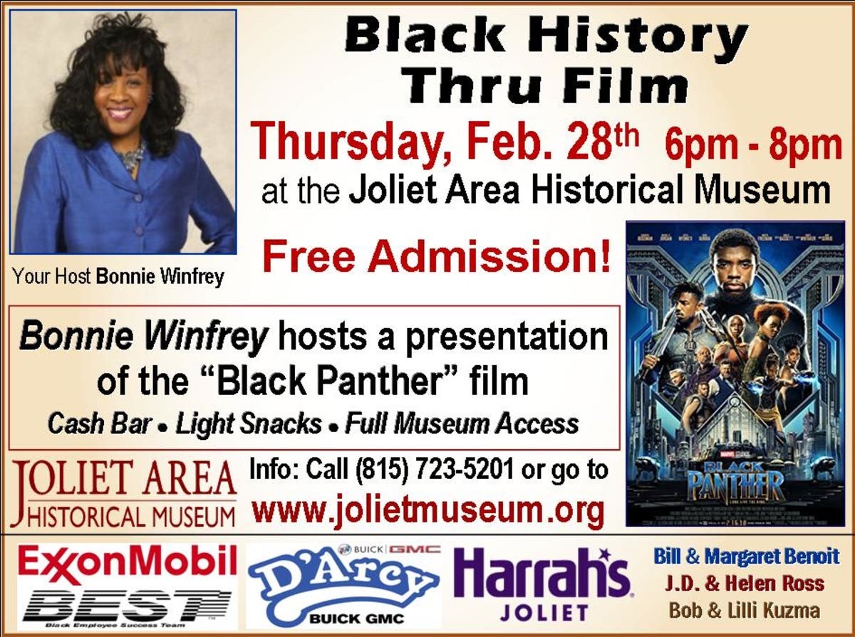Join us at the Joliet Area Historical Museum for our final Black History Month segment, "Black History Thru Film" where host Bonnie Winfrey will show clips and lead a discussion on the "Black Panther"hit movie.