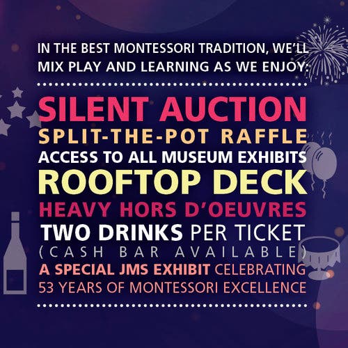 Joliet Montessori School (JMS) also has a 53-year history as a quiet, not-for-profit backbone of the civic spirit we have in the Joliet community. Now celebrating their 53rd year of Montessori education, JMS has teamed up with the Museum for a special night of rooftop drinks and apps, plus full access for you and your friends to all exhibits.