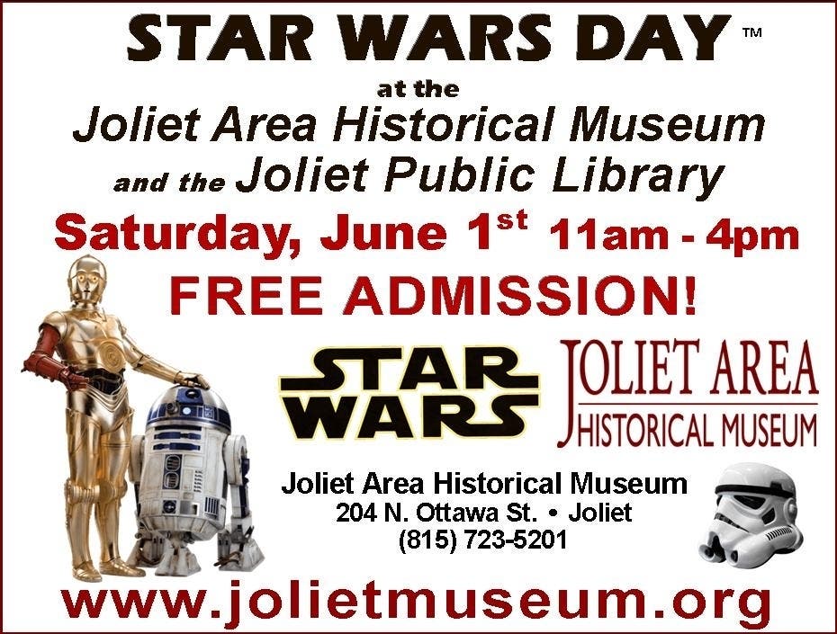 It's almost here! The annual STAR WARS DAY event in Downtown Joliet, hosted by the Joliet Public Library and the Joliet Area Historical Museum takes place this Saturday, June 1st from 11am - 4pm! FREE ADMISSION!