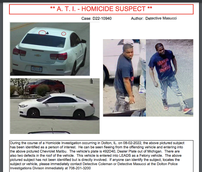 Dolton police have named a person of interest in the August 2 murder of local businessman Tavares Davis.
