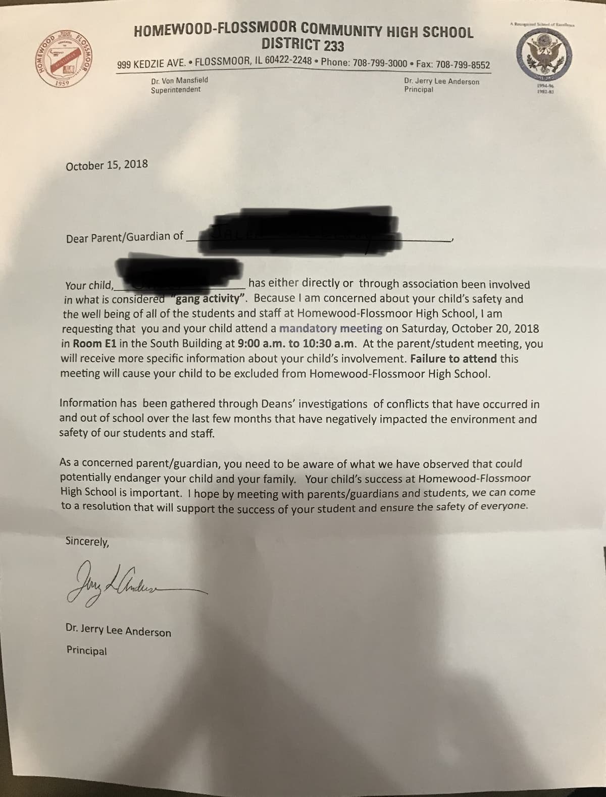 FLOSSMOOR, IL — With just a few days notice, some parents of students at Homewood-Flossmoor High School were required to attend a mandatory meeting over the weekend regarding what Principal Dr. Jerry Lee Anderson called "gang activity" involving students at the school. In a letter addressed to the parents earlier in the week, Anderson said that failure to attend the meeting would mean the student would be "excluded from Homewood-Flossmoor High School."