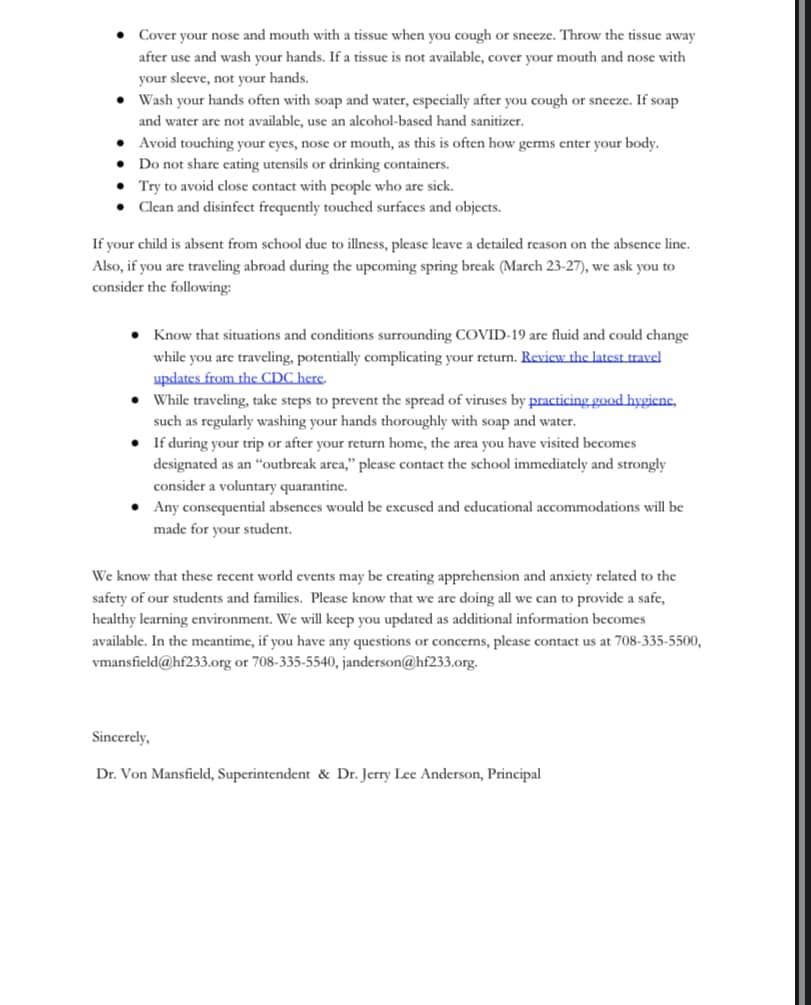 FLOSSMOOR, IL — There are no confirmed cases of the coronavirus affecting any student at Homewood-Flossmoor High School, although one student is under a voluntary quarantine.