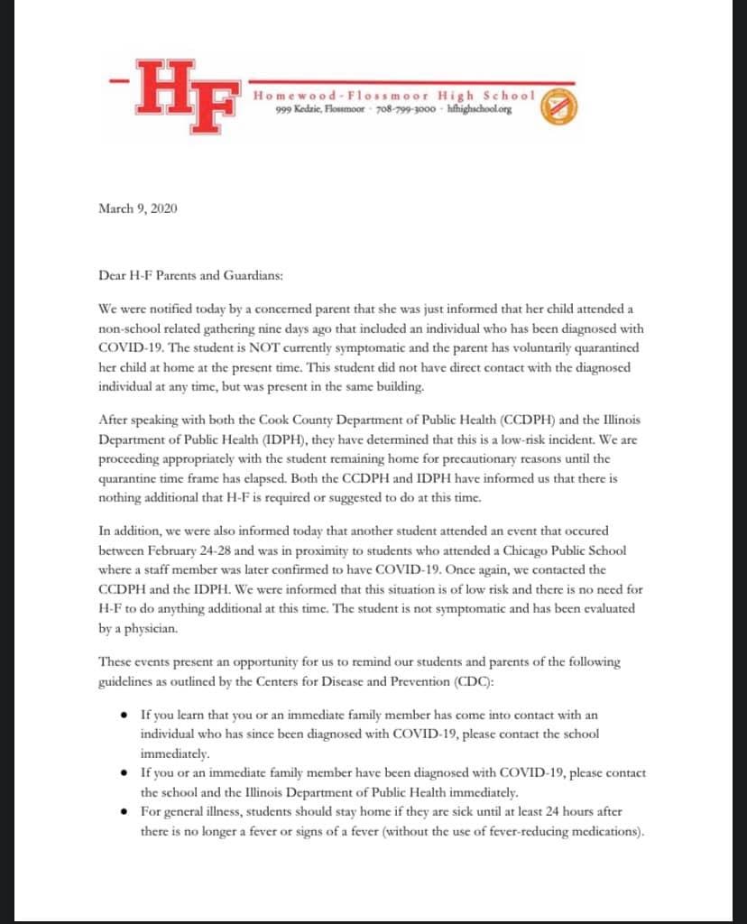 The student "is not symptomatic" and can come to school at any time, Homewood-Flossmoor High School Principal Dr. Jerry Lee Anderson said after administrators sent a letter to district families updating them of the situation.