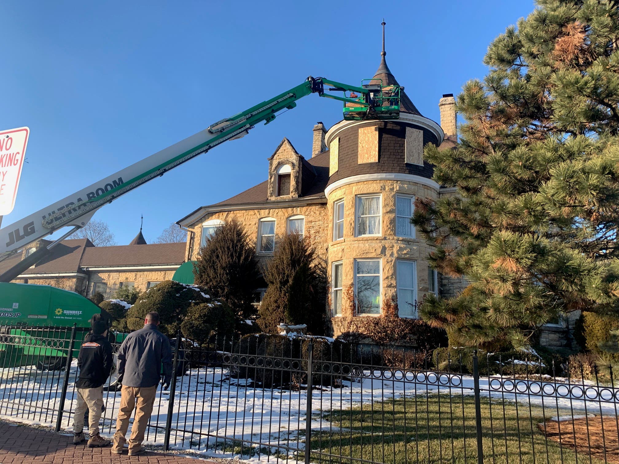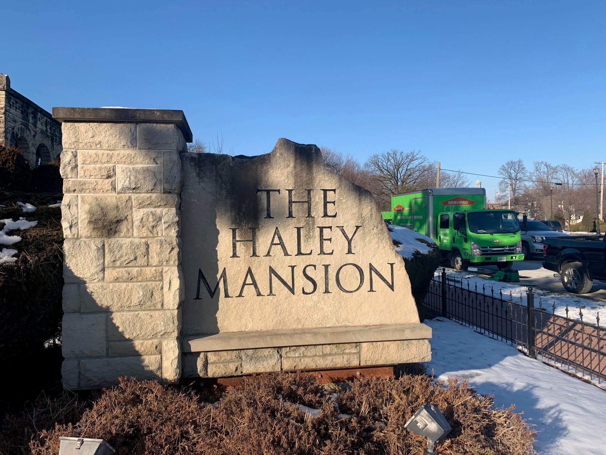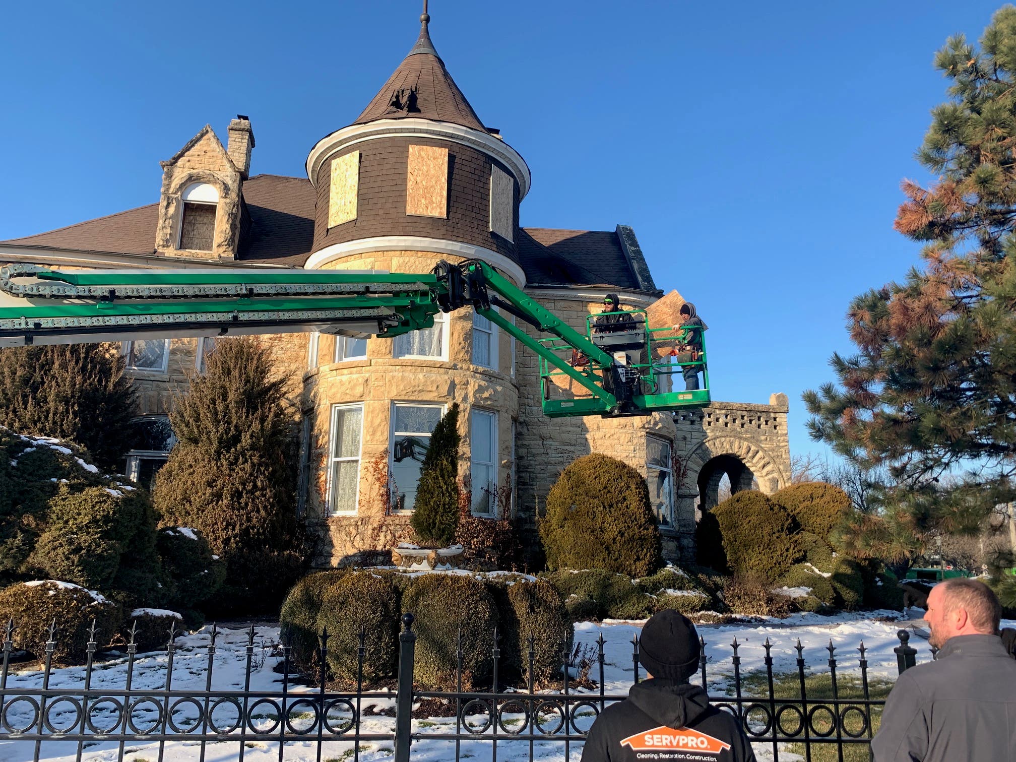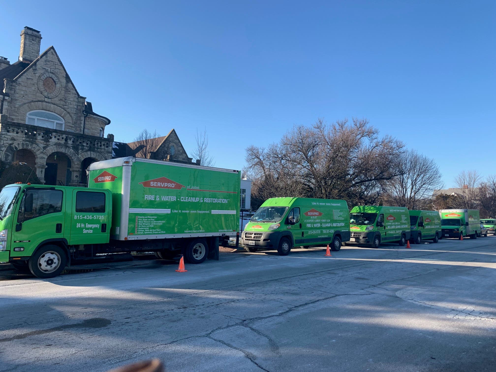 JOLIET, IL — Neon green Servpro vehicles lined South Center Street and Marion Street Thursday as the damage restoration company began cleaning up the mess caused by Wednesday afternoon's devastating fire inside Joliet's Haley Mansion.