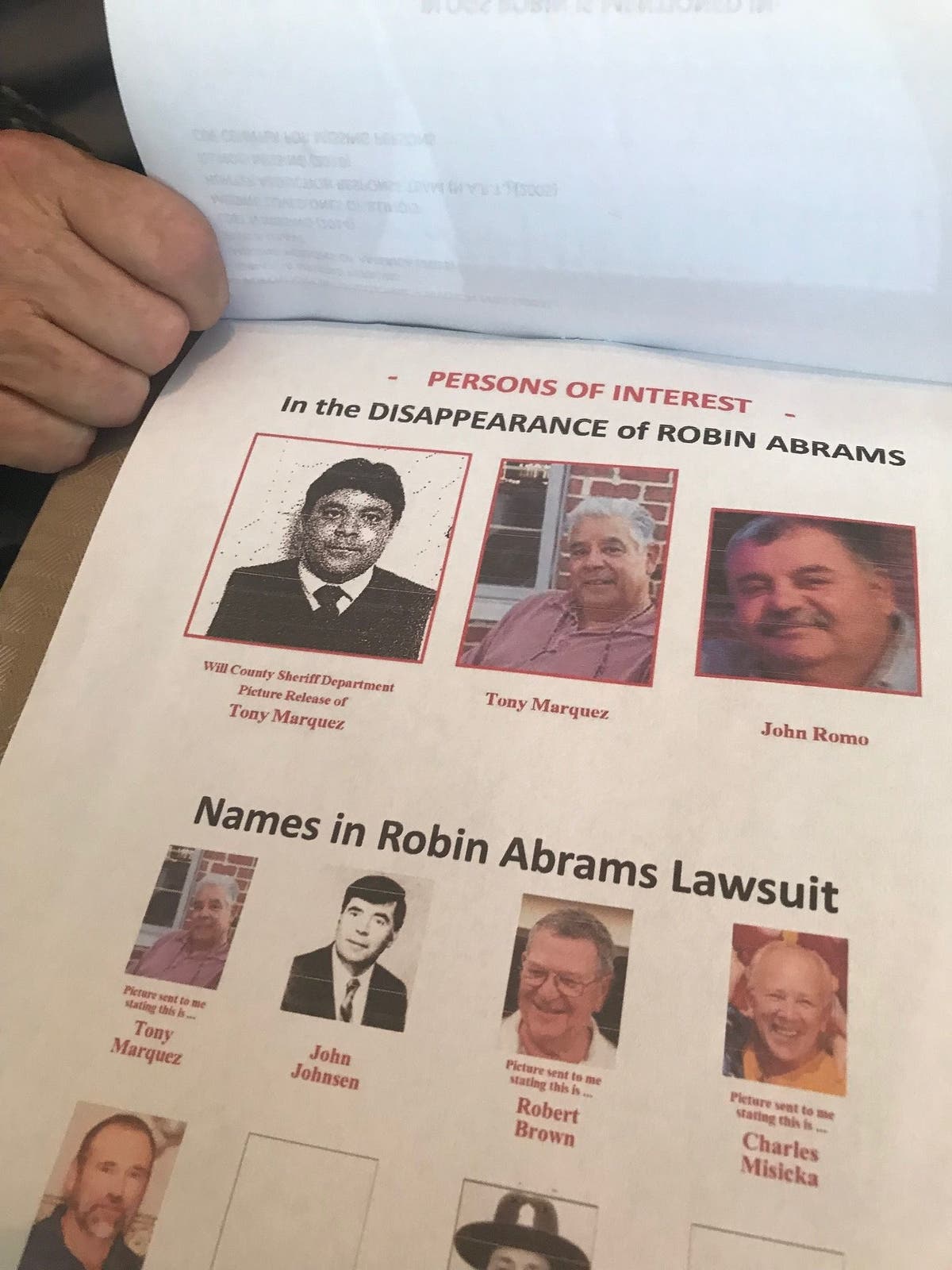 In 1989, Abrams filed a federal civil rights lawsuit against the Will County Sheriff's Department. John Johnsen was sheriff at the time. Other men named in her lawsuit were: Marquez, Robert Brown, Charles Misicka, Thomas Carey, Lawrence Lauffer, Raymond van Dyke and Anthony Luccenti.