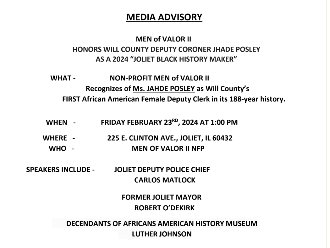 JOLIET, IL — Will County Deputy Coroner Jhade Posley was honored by local non-profit organization Men of Valor II for her service as the first African American female Deputy Coroner in the 188-year history of the county.
