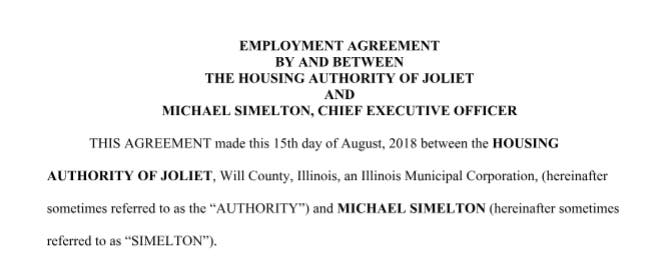 Simelton will also continue to have access to the Joliet Housing Authority's employee fringe benefits plan. "Simelton shall be entitled to vacation, sick leave, travel reimbursement, educational reimbursement and all other benefits of employments not in conflict with the terms of this agreement," the contract states.