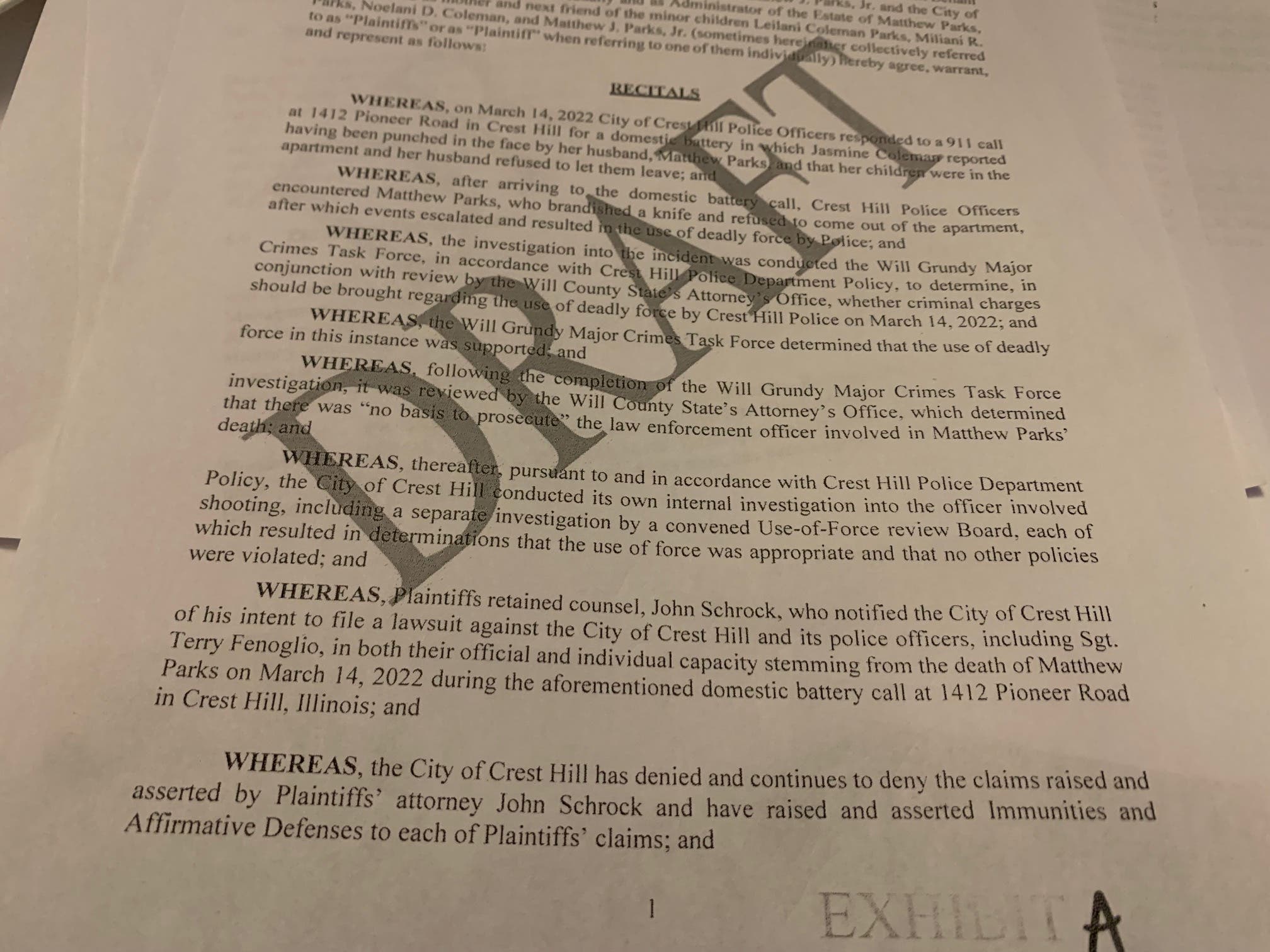 CREST HILL — Before a wrongful death lawsuit was even filed against Crest Hill's Police Department, Crest Hill has agreed to pay out $425,000 to Jasmine Coleman, the young widow and mother of four children to Matthew Parks.