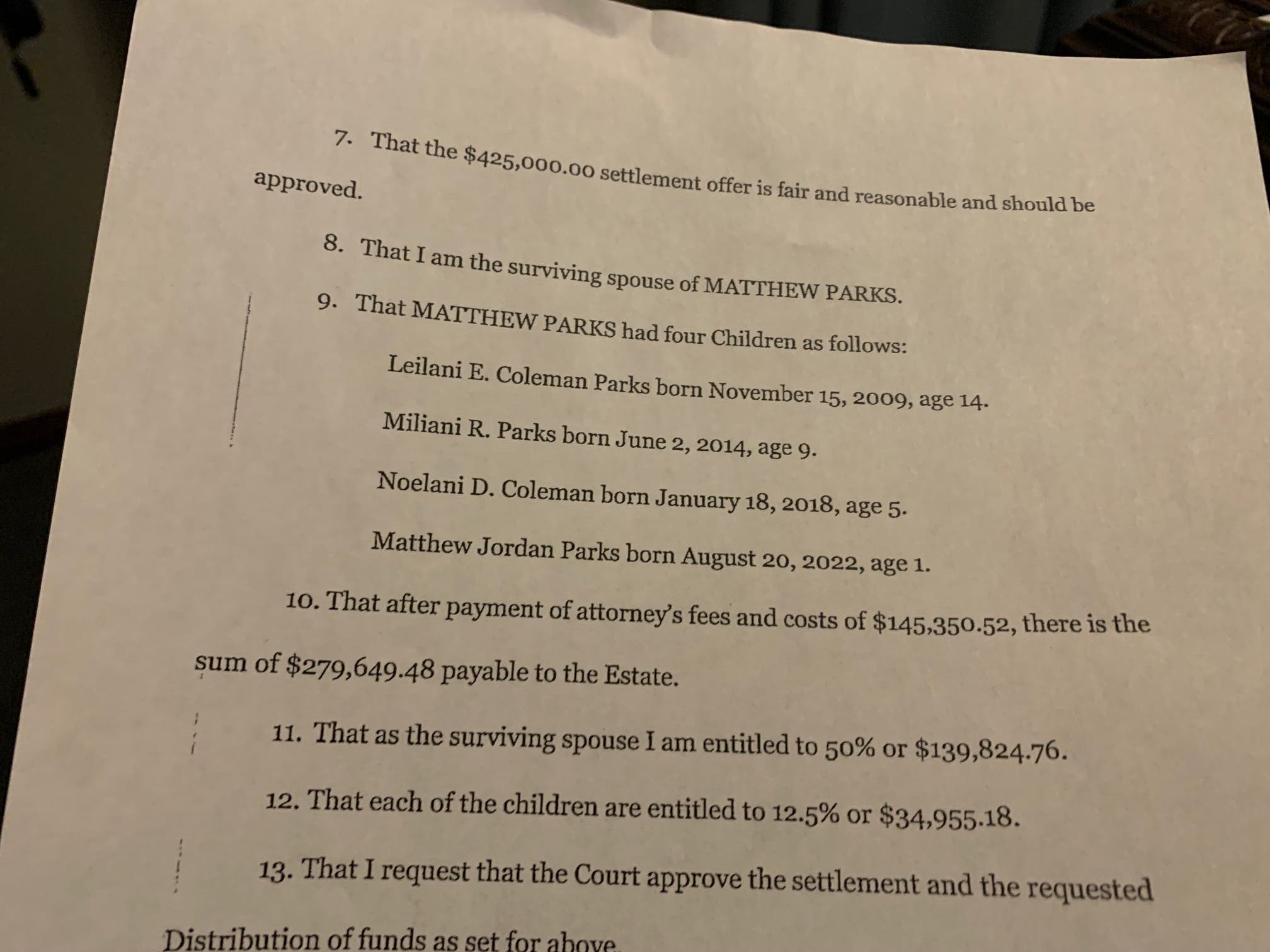 At the time of his death, Parks was unemployed, the motion to approve the settlement and distribution of settlement funds informs the court.