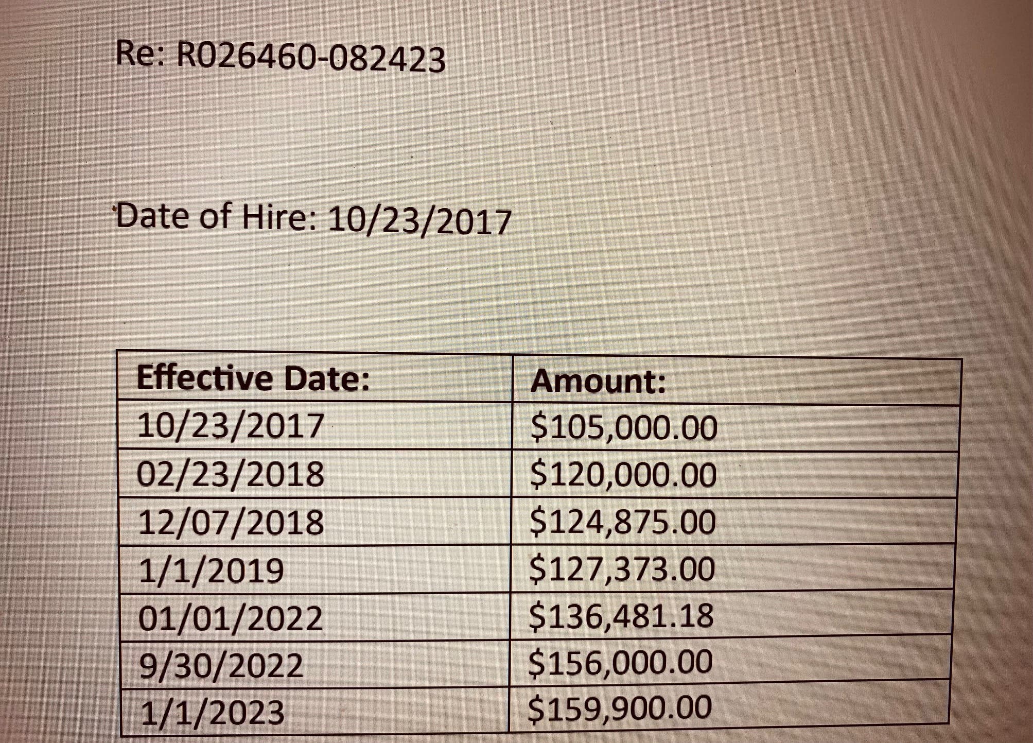 Franson response: "January of 2022 was a retroactive increase that all employees received based on salaries – not a separate increase. The increase provided at the end of 2022 recognized 5 years of changes/updates, etc. in the HR department, as well as recognizing salary surveys for the role, and other current department head salaries and structure."