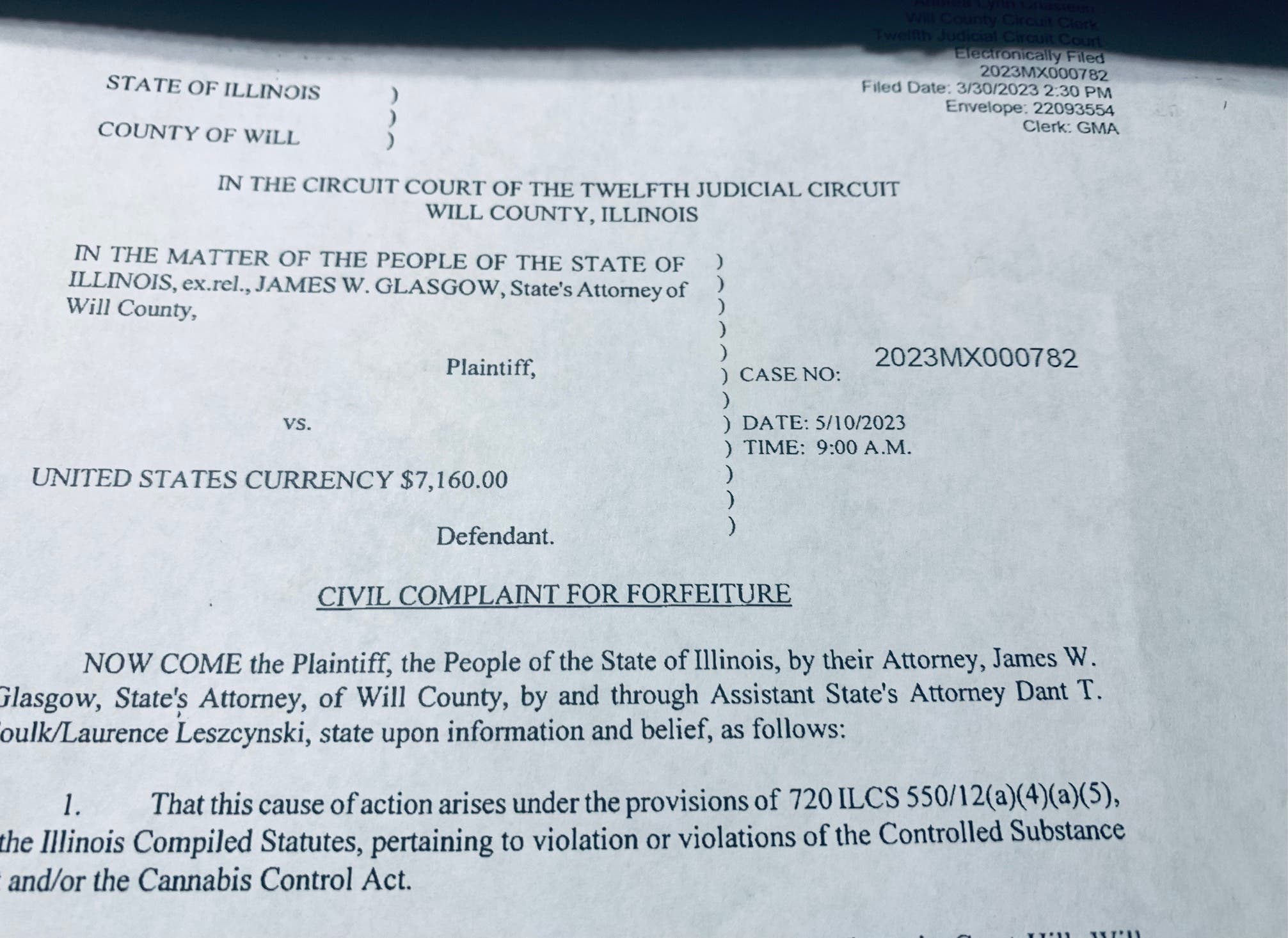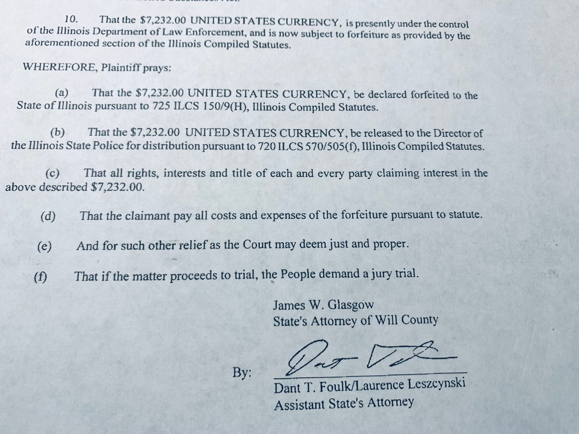 Now, four months later, the Will County State's Attorney's Office has filed a civil forfeiture complaint asking that a judge declare the $7,232 found inside the gunshot victim's car a forfeited asset for police.